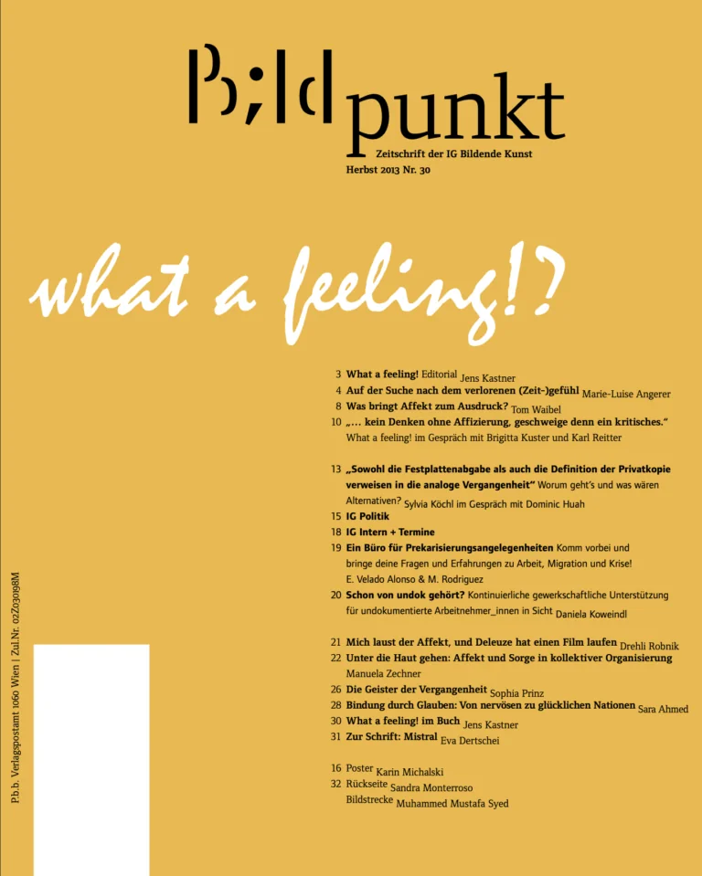 Bildpunkt: Im Kunstfeld sind der Affekt bzw. die Affizierung schon lange Thema. Die Konzeptkünstlerin Andrea Fraser hat das Wiedererstarken des Affektdiskurses 2007 als Gegen bewegung zu (postkolonialistischen und kritischen) Theorien sozial und historisch verwurzelter Subjektivitäten beschrieben. Andere sehen in ihm gerade deren Fortsetzung. Wie seht Ihr das?