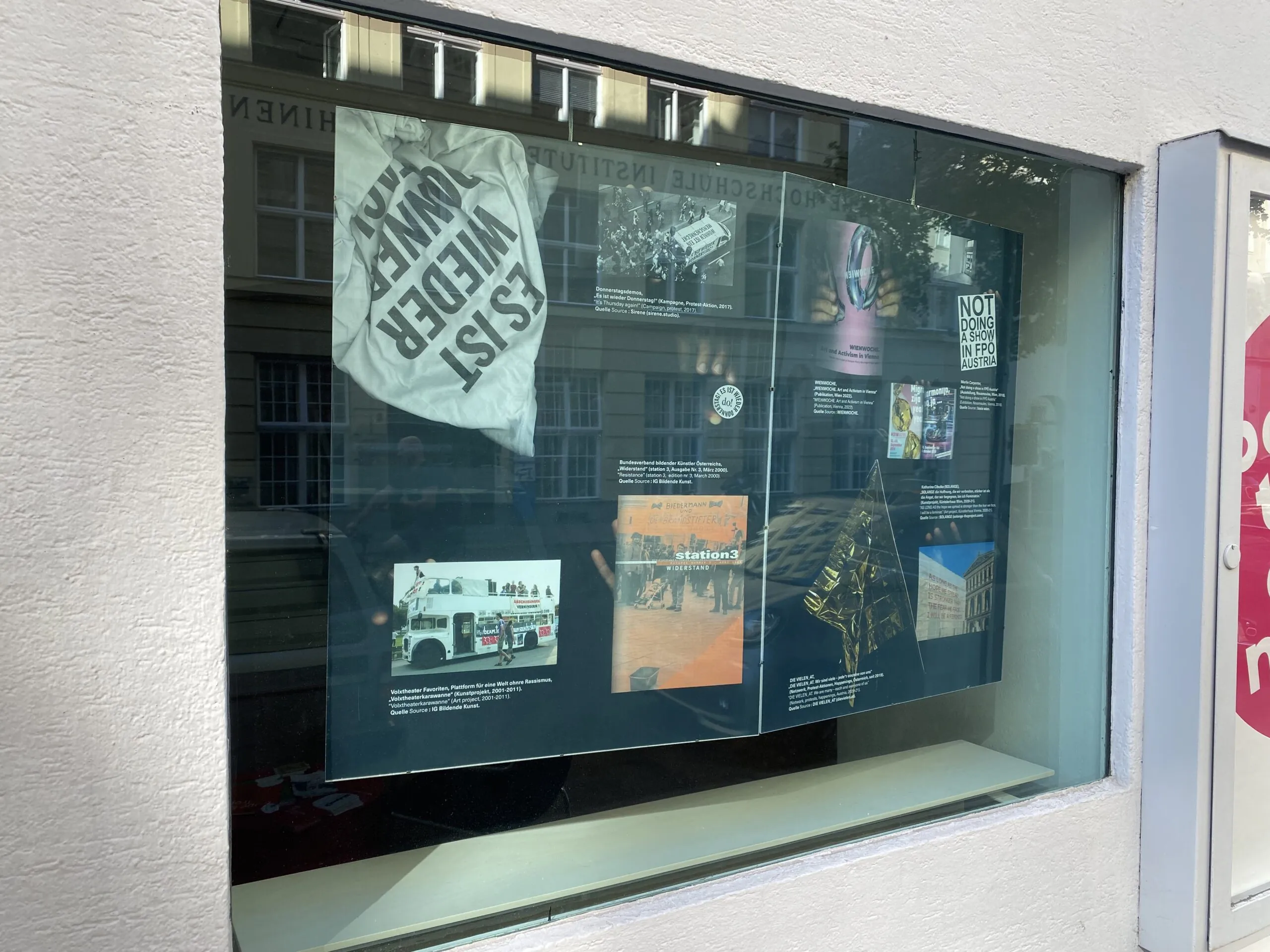 Als Teil unserer Kampagne KÜNSTLER:INNEN GEGEN RECHTS möchten wir anlassbezogen zu den anstehenden Nationalratswahlen im September 2024 gemeinsam einen Blick in die Vergangenheit der österreichischen Kunst- und Kulturszene werfen. Wir teilen Projekte, Aktionen, Ausstellungen und Kunstwerke, die sich sowohl als Form von politischen Widerstand gegen einen auch damals aufkommenden Rechtsruck (2000, 2017) verstehen, als auch für eine gleichberechtigte und vielfältige (kultur)politische Landschaft aussprechen. In unseren Fenstern zeigen wir eine Sammlung dieser Projekte, um nicht zu vergessen, dass wir im Kampf gegen den Rechtsruck nicht alleine sind und ebenso nicht bei Null anfangen. Wir sind nicht die ersten und werden auch nicht die letzten sein, die sich stark machen für eine Demokratie, frei von Ausschluss, Diskrminierung und Einschränkungen der Freiheit in Kunst und Kultur. Über die einzelne Projekte im gezeigten Archiv erfahrt ihr mehr über unsere Social Media Kanäle — stay tuned @igbildendekunst.